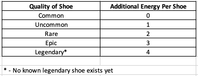 Keep in mind that these energy levels apply to common shoes. If you have higher quality shoes (Uncommon, Rare, etc.) please see the next section.
